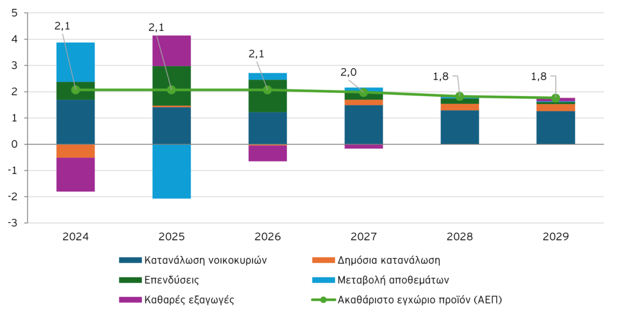 Από το 2027 και έπειτα, η ανάπτυξη στην Ελλάδα αναμένεται σταδιακά να ομαλοποιηθεί, μετά από μία περίοδο κορύφωσής της, καθώς η δυναμική των επενδύσεων θα περιοριστεί εξαιτίας της ολοκλήρωσης της χρηματοδότησης από το NGEU. Από την άλλη πλευρά, η βελτιούμενη δημοσιονομική θέση της χώρας δημιουργεί περιθώρια για άμβλυνση των πιέσεων που ασκεί το ενεργειακό κόστος σε νοικοκυριά και επιχειρήσεις, καθώς και για τη στήριξη της εγχώριας ζήτησης και τη συγχρηματοδότηση επενδύσεων, συμβάλλοντας, έτσι, στον μετριασμό των επιπτώσεων από τη σταδιακή επιβράδυνση της χρηματοδοτούμενης από την ΕΕ επενδυτικής δραστηριότητας.