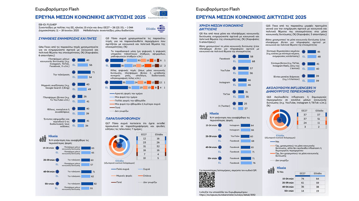 Τα αποτελέσματα της έρευνας flash Ευρωβαρόμετρο «Social Media 2025», που διεξήχθη τον Ιούνιο του 2025, δημοσίευσε το Ευρωπαϊκό Κοινοβούλιο. Η έρευνα καταδεικνύει ότι τα μέσα κοινωνικής δικτύωσης έχουν αναδειχθεί σε βασική πηγή ενημέρωσης για μεγάλο μέρος των πολιτών, και στην Ελλάδα, ενώ η έκθεση σε παραπληροφόρηση και ψευδείς ειδήσεις συνεχίζει να αποτελεί σημαντική πρόκληση για όλη την ΕΕ.