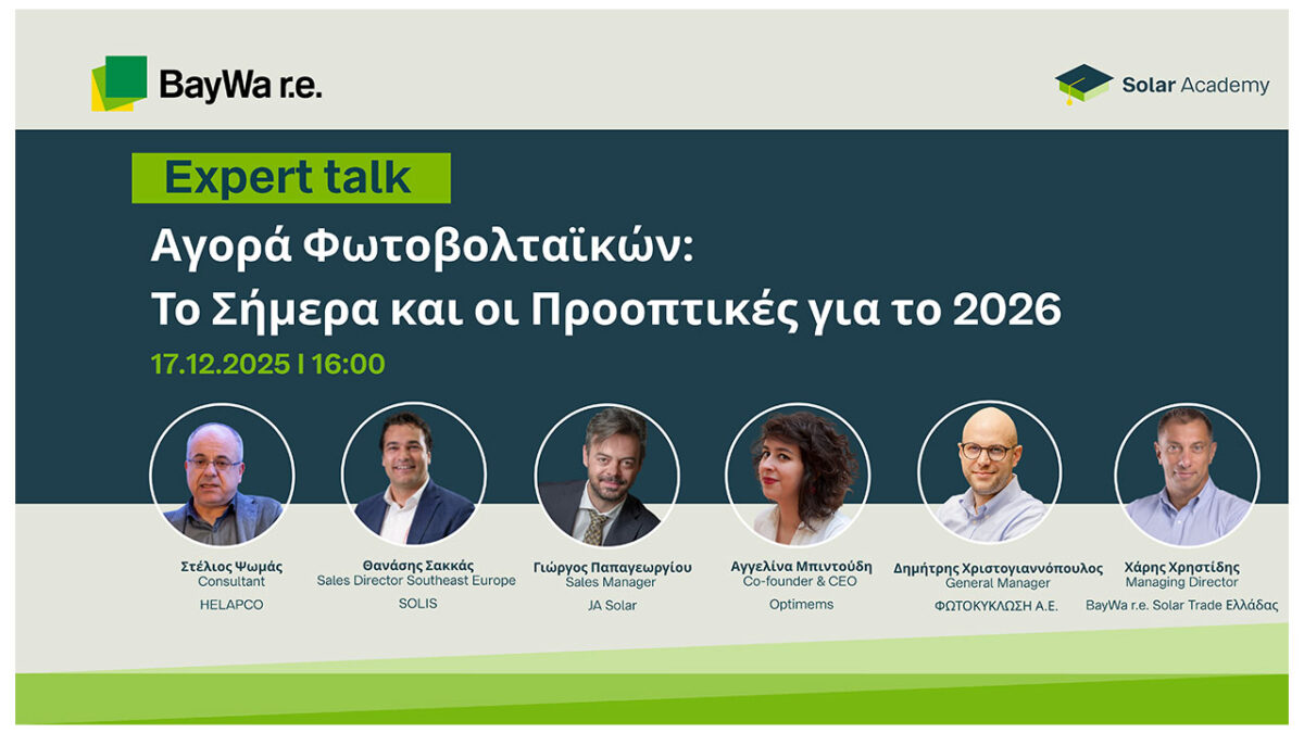 Με το Expert Talk «Αγορά Φωτοβολταϊκών και Τάσεις για το 2026», η BayWa r.e. Solar Trade διοργανώνει μια θεματική συζήτηση με κορυφαία στελέχη του κλάδου και ανοίγει τον διάλογο για την αγορά φωτοβολταϊκών.