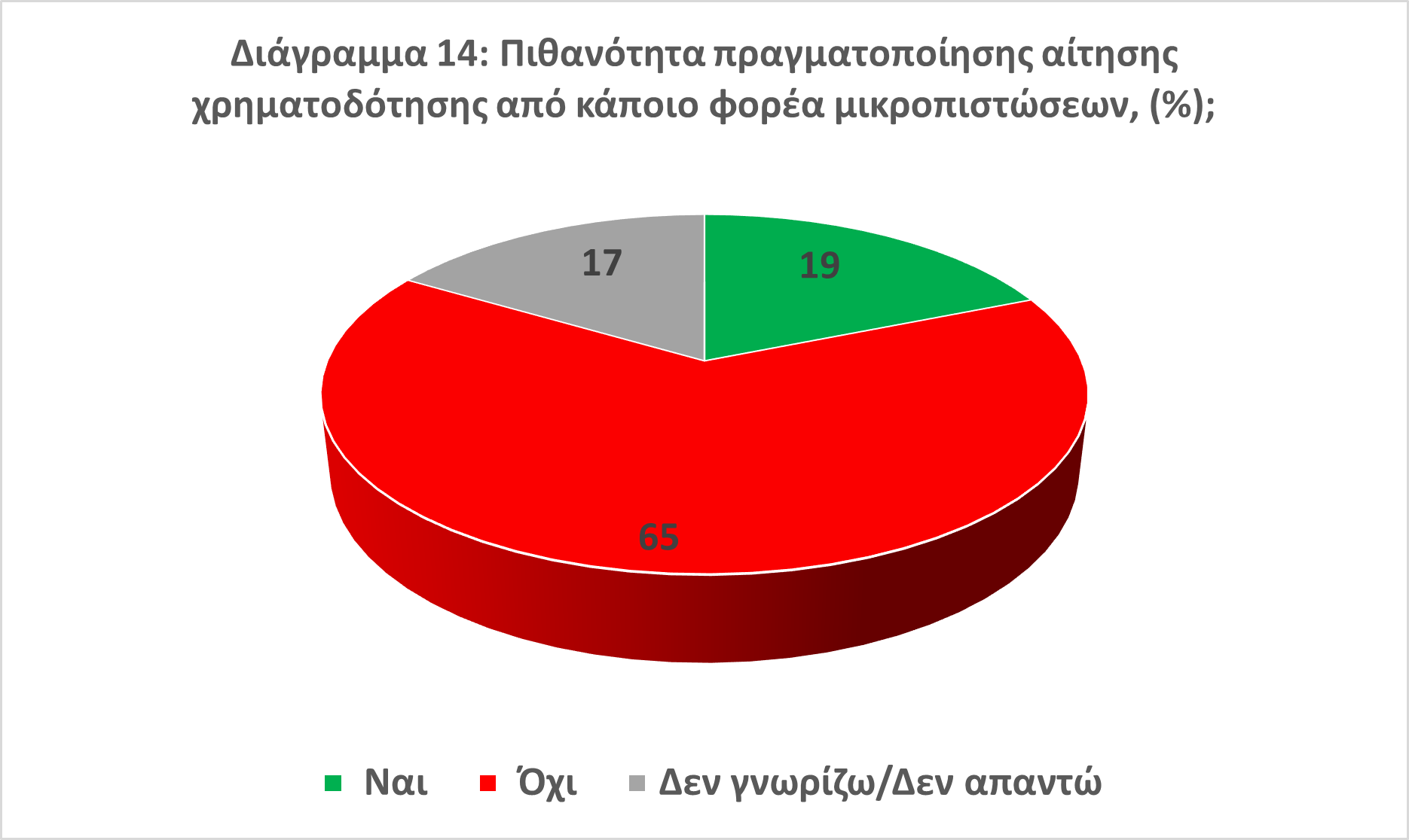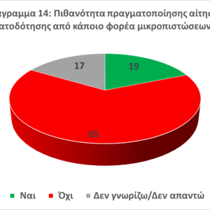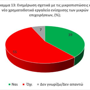 - Μόλις 4 στις 10 επιχειρήσεις εμφανίζονται ενημερωμένες αναφορικά με το χρηματοδοτικό εργαλείο των μικρο-πιστώσεων, αν και οι περισσότερες από τις ενημερωμένες (65%) δεν σκοπεύουν να αιτηθούν για σχετικό δάνειο (Διαγράμματα 13 και 14).