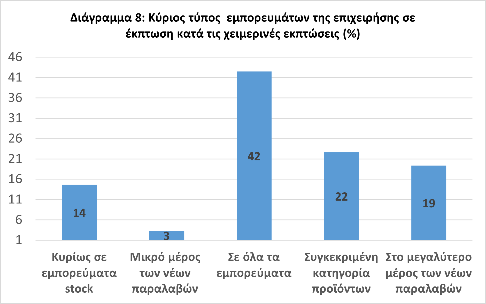 - Τέσσερις στις 10 επιχειρήσεις πραγματοποίησαν εκπτώσεις σε όλα τα εμπορεύματα του καταστήματος. Εντούτοις, σημαντικό μερίδιο (22%) επιχειρηματιών υιοθέτησε εκπτώσεις σε συγκεκριμένα προϊόντα, ενδεχομένως ως επιχειρηματική τακτική, εξαιτίας και της διόγκωσης του κόστους προμηθευτών (Διάγραμμα 8).