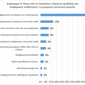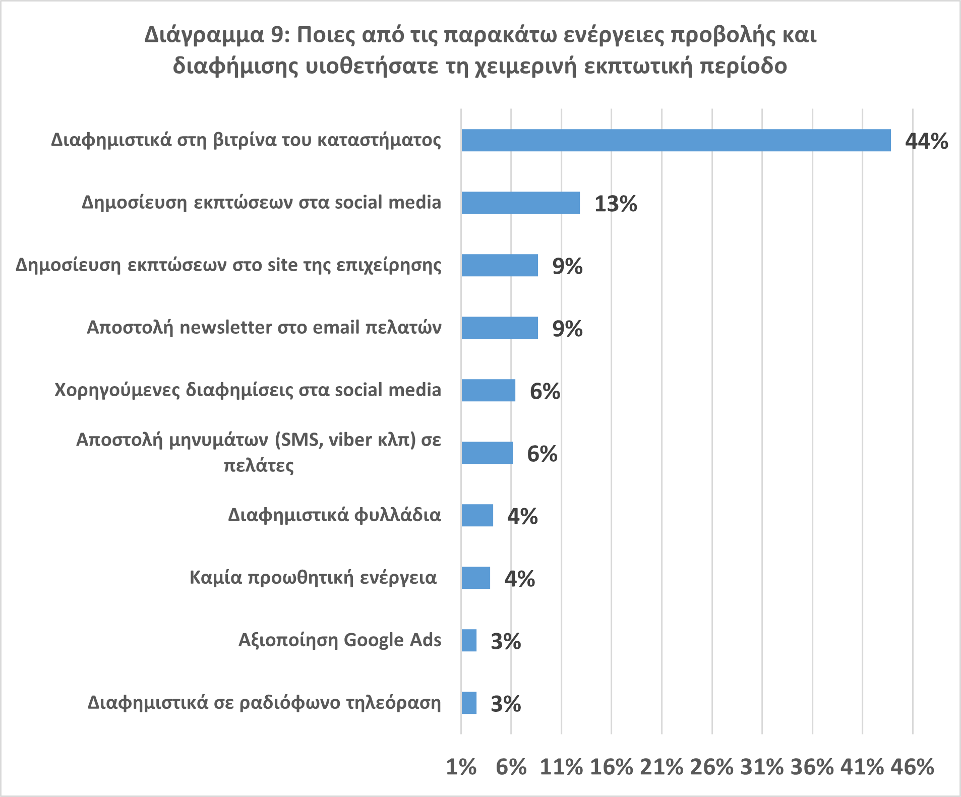 - Κυρίαρχος και με διαφορά από τον επόμενο τρόπος προβολής και διαφήμισης των εκπτώσεων παραμένουν τα σχετικά μηνύματα στη βιτρίνα του καταστήματος ενώ ολοένα και πιο δυναμικό ρόλο φαίνεται να διαδραματίζουν τα social media (Διάγραμμα 9).