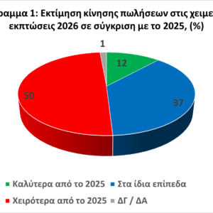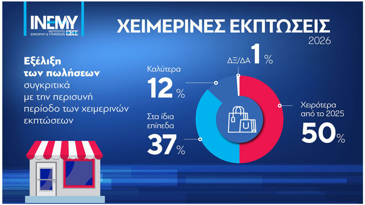 Στη διάρκεια των φετινών εκπτώσεων, 1 στις 2 επιχειρήσεις πραγματοποίησαν μικρότερο κύκλο εργασιών και μόλις 1 στις 10 επιχειρήσεις μεγαλύτερο συγκριτικά με την αντίστοιχη περίοδο πέρυσι, εξέλιξη που επαυξάνει την ένταση των κλυδωνισμών που προκάλεσε η μείωση των πραγματικών πωλήσεων στο σύνολο του 2025. Παρά τις γενναιόδωρες μειώσεις τιμών, η υποτονική κίνηση οφείλεται στη μειωμένη αγοραστική δύναμη των καταναλωτών, οι οποίοι στρέφονται πρώτα στην κάλυψη των βασικών τους αναγκών, αλλά και στoν αντίκτυπο του αθέμιτου ανταγωνισμού από τις ασιατικές πλατφόρμες. Ως εκ τούτου, οι πιέσεις στο εμπόριο, στον ισχυρότερο κλάδο της οικονομίας σε όρους κύκλου εργασιών και απασχόλησης, διατηρούνται και στις αρχές του 2026, διευρύνοντας την αβεβαιότητα εν μέσω, μάλιστα, ενός ιδιαίτερα ρευστού διεθνούς περιβάλλοντος.