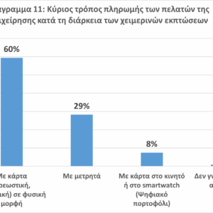 - Οι πληρωμές με μετρητά περιορίζονται διαρκώς, καθώς μόλις στο 29% των επιχειρήσεων η πληρωμή έγινε κυρίως με αυτά (Διάγραμμα 11).