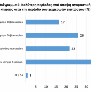 - Οι πωλήσεις για 1 στις 3 επιχειρήσεις δεν διαφοροποιήθηκαν ουσιαστικά κατά τη διάρκεια της εκπτωτικής περιόδου. Ωστόσο, η σημασία του Ιανουαρίου για τις πωλήσεις φαίνεται να περιορίζεται, εύρημα που επαναλαμβάνεται για δεύτερη συνεχή χρονιά, και υπογραμμίζει πως το δώρο των Χριστουγέννων (στον ιδιωτικό τομέα) ανακατευθύνεται στην κάλυψη άλλων αναγκών, κυρίως ανελαστικών (Διάγραμμα 5).