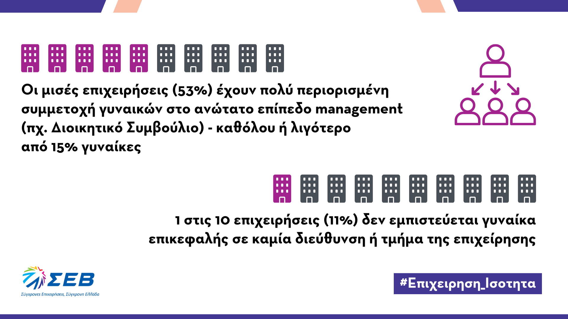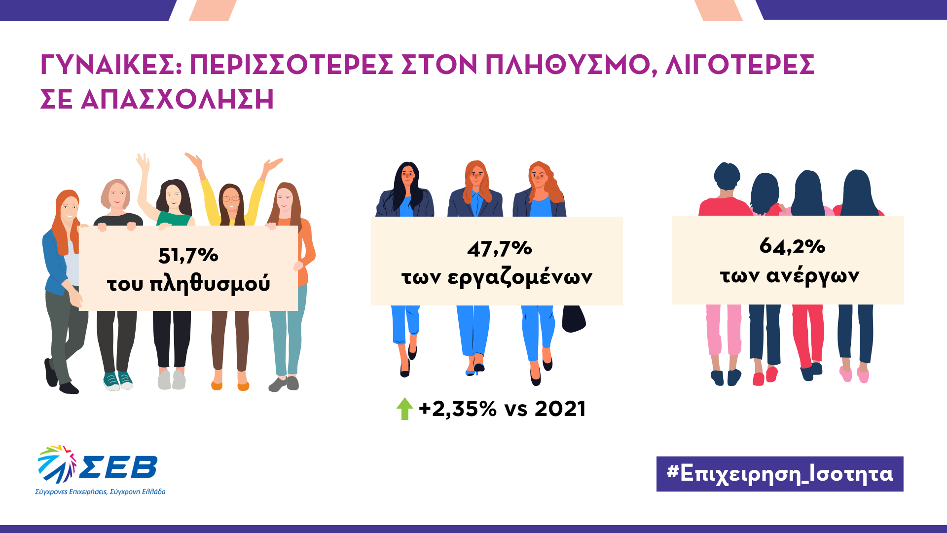 Με αφορμή την έρευνα, o ΣΕΒ προγραμματίζει για το επόμενο διάστημα καμπάνια ενημέρωσης και ευαισθητοποίησης για την ενίσχυση της απασχόλησης των γυναικών και την προώθηση της ισότητας των φύλων στην εργασία. Η καμπάνια έχει τίτλο Επιχείρηση Ισότητα και μπορείτε να δείτε το τρέιλερ εδώ.