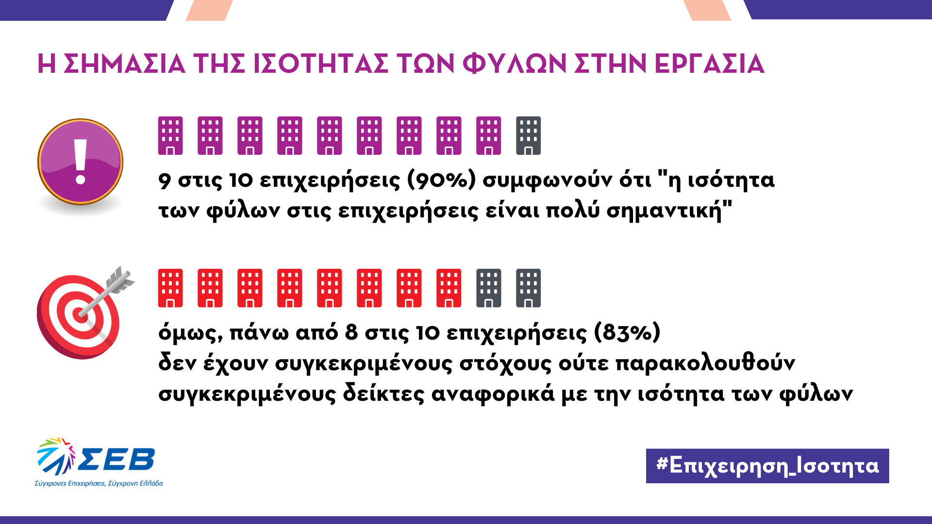 Παρουσιάζοντας τα αποτελέσματα της έρευνας, η Διευθύνουσα Σύμβουλος των UNI-PHARMA SA & InterMed SA, Γενική Γραμματέας του ΔΣ του ΣΕΒ και επικεφαλής της ομάδας εργασίας του ΣΕΒ για τη Διαφορετικότητα, τη Συμπερίληψη και την Ισότητα, κυρία Ιουλία Τσέτη, επισήμανε τις εκτιμήσεις των επιχειρήσεων και του κοινού για διάφορες πτυχές της ισότητας των φύλων στην εργασία, όπως κατηγοριοποιούνται σε τέσσερις βασικές ενότητες: απασχόληση και αμοιβές, προσλήψεις και επαγγελματική ανάπτυξη, πολιτικές – παροχές – θεσμικό πλαίσιο και βία και παρενόχληση. «Για τον ΣΕΒ, η ισότητα εμπεριέχει κάτι πολύ μεγαλύτερο από τις ίσες ευκαιρίες των γυναικών στην εργασία. Αποτελεί πρωτίστως κουλτούρα και συμπεριφορά που αναδεικνύει τις ικανότητες χωρίς αποκλεισμούς, δημιουργεί δεξαμενές ταλέντου ισότιμα από άντρες ή γυναίκες, σέβεται την προσωπικότητα», ανέφερε η κυρία Τσέτη και συμπλήρωσε: «μια επιχείρηση είναι πραγματικά επιτυχημένη όταν ενστερνίζεται την ισότητα και τη συμπερίληψη όχι απλά ως υποχρέωση απέναντι σε ομάδες εργαζομένων, αλλά ως βασικό συστατικό δημιουργικότητας και αλλαγής υποδείγματος λειτουργίας».