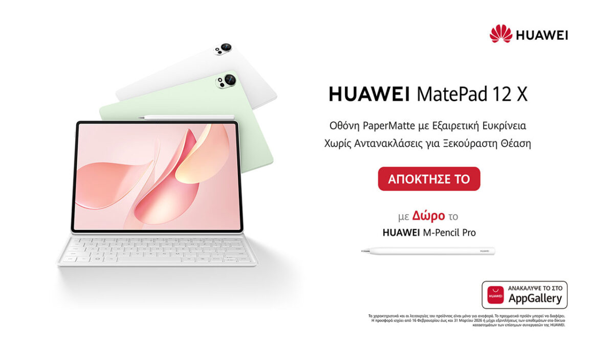 *Το νέο HUAWEI MatePad 12 X είναι πλέον διαθέσιμο στην ελληνική αγορά. Το πληκτρολόγιο συμπεριλαμβάνεται στην συσκευασία ενώ το M-Pencil Pro δίνεται δώρο με κάθε αγορά. Η προσφορά ισχύει έως 31/3/2026 ή έως εξαντλήσεως των αποθεμάτων.