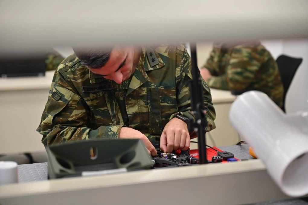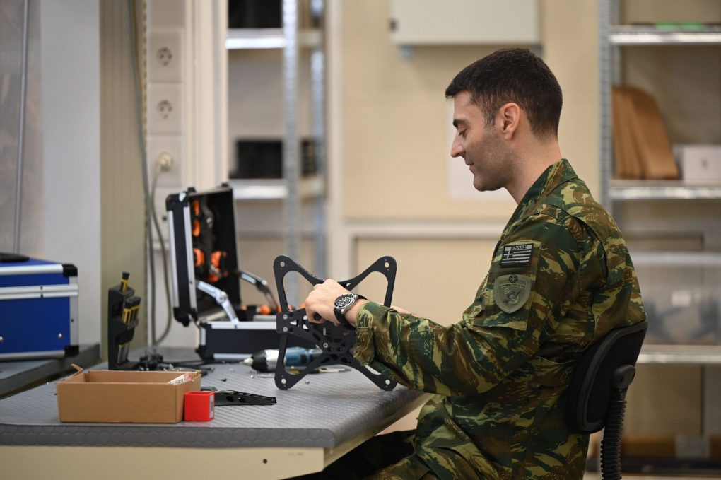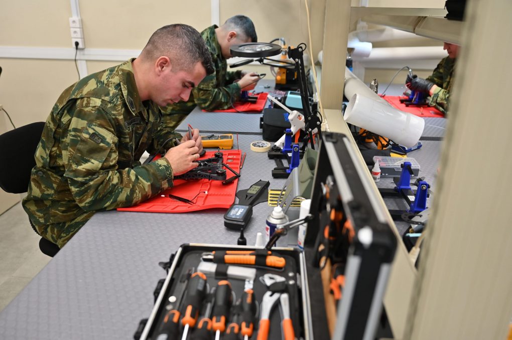 Εδώ έχουμε ένα εργοστάσιο παραγωγής μη επανδρωμένων αεροχημάτων, drones, κατηγορίας Ι και First Person View (FPV), αλλά και μεγαλύτερων drones κατηγορίας Ι, καθώς επίσης εδώ έχουμε αναπτύξει δύο πρωτότυπους φορητούς σταθμούς παραγωγής drones, οι οποίοι θα εμφανιστούν για πρώτη φορά στην παρέλαση της 28ης Οκτωβρίου στη Θεσσαλονίκη. Και είναι κατασκευασμένοι για να ακολουθούν τις μεγάλες μονάδες μας. Δηλαδή, να μπορούν να παράγουν FPV drones επί του πεδίου.