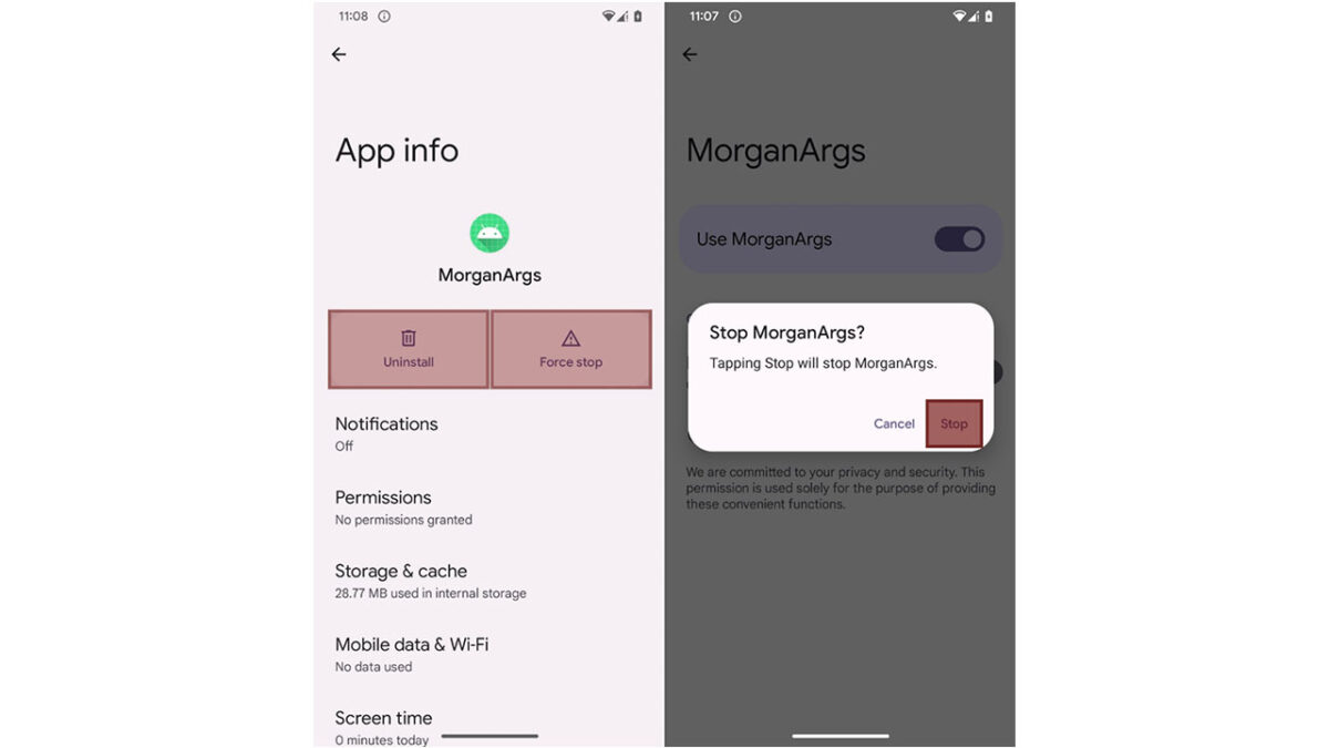 Για να εισέλθουν σε ασφαλή λειτουργία, οι χρήστες συνήθως πρέπει να πατήσουν και να κρατήσουν πατημένο το κουμπί λειτουργίας, έπειτα να πατήσουν παρατεταμένα την επιλογή απενεργοποίησης και να επιβεβαιώσουν την προτροπή για επανεκκίνηση σε ασφαλή λειτουργία. Η ακριβής διαδικασία ενδέχεται να διαφέρει ανάλογα με τη συσκευή και τον κατασκευαστή. Αφού το τηλέφωνο επανεκκινήσει σε ασφαλή λειτουργία, ο χρήστης μπορεί να μεταβεί στις Ρυθμίσεις → Εφαρμογές → MorganArg και να το απεγκαταστήσει χωρίς εμπόδια.