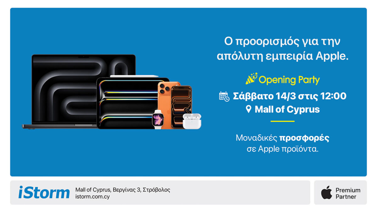 Η iStorm σας προσκαλεί το Σάββατο 14 Μαρτίου, στις 12:00 στα εγκαίνια του πρώτου Apple Premium Partner Store στο Εμπορικό Κέντρο Mall of Cyprus στη Λευκωσία, για να ανακαλύψετε τον απόλυτο Apple προορισμό.