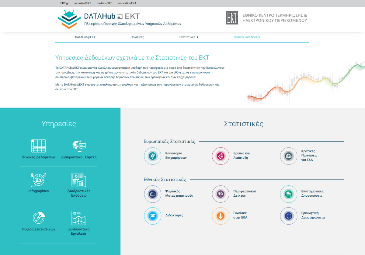 Η πλατφόρμα (https://datahub.ekt.gr) παρέχει διαδραστική πρόσβαση σε στατιστικά δεδομένα για Έρευνα, Καινοτομία και Ψηφιακό Μετασχηματισμό, και αποτελεί μία τεχνολογικά ώριμη και ολοκληρωμένη λύση για τη διαχείριση, ανάλυση και παροχή δημόσιων δεδομένων. Με τον τρόπο αυτό αναδεικνύεται ο πρωτοπόρος ρόλος του ΕΚΤ στη διακυβέρνηση δεδομένων και στον ψηφιακό μετασχηματισμό του κράτους.