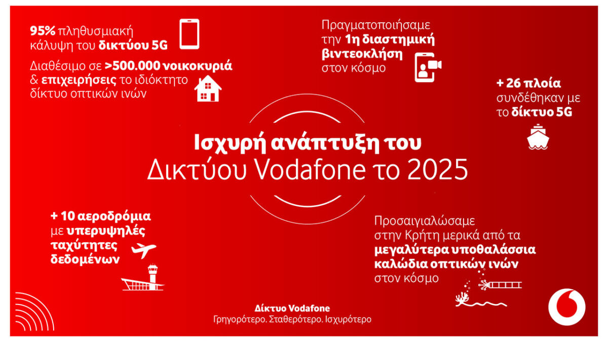 Η Vodafone ολοκλήρωσε το 2025 έναν ακόμη κύκλο δυναμικών επενδύσεων και τεχνολογικών εξελίξεων, ενισχύοντας ουσιαστικά το δίκτυο κινητής και σταθερής τηλεφωνίας σε ολόκληρη τη χώρα και διαμορφώνοντας νέες προοπτικές συνδεσιμότητας για πολίτες, επιχειρήσεις και επισκέπτες.