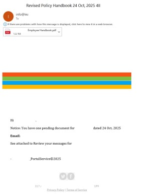 - Ψεύτικες ειδοποιήσεις από τμήματα ανθρώπινου δυναμικού, οι οποίες προτρέπουν τους εργαζομένους να ελέγξουν ή να υπογράψουν έγγραφα, όπως προγράμματα αδειών ή ακόμη και να δουν λίστες απολυμένου προσωπικού, καταλήγοντας τελικά σε ιστοσελίδες υποκλοπής διαπιστευτηρίων.