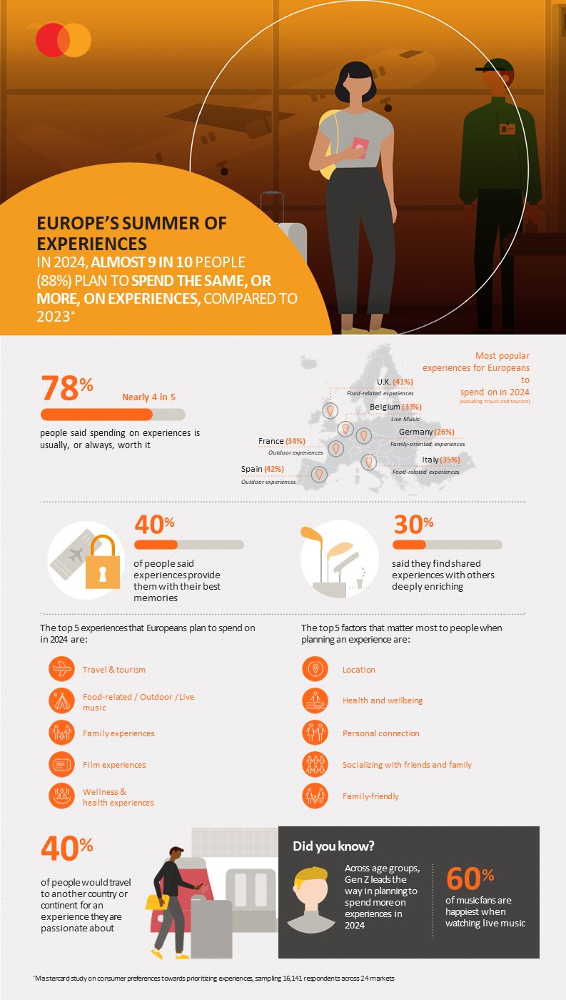 Πιο συγκεκριμένα, η Ευρώπη, ως κορυφαίος προορισμός με σταθερά υψηλό αριθμό διεθνών τουριστικών αφίξεων, το 2023 υποδέχθηκε 700 εκατομμύρια τουρίστες. Σύμφωνα με την έρευνα της Mastercard, η οποία πραγματοποιήθηκε σε δείγμα μεγαλύτερο των 16.000 καταναλωτών, φέτος τόσο οι Ευρωπαίοι όσο και οι διεθνείς επισκέπτες θα επικεντρωθούν σε δαπάνες για εμπειρίες. Σχεδόν 9 στους 10 ερωτηθέντες (88%) δήλωσαν ότι σκοπεύουν να ξοδέψουν τα ίδια ή περισσότερα χρήματα για δραστηριότητες αναψυχής το 2024, σε σύγκριση με το 2023.