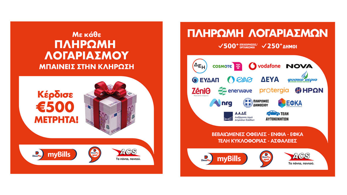 Από σήμερα και έως τις 31 Ιουλίου, κάθε πελάτης που επιλέγει την υπηρεσία «DirectPay myBills» σε ένα κατάστημα της ACS για την εξόφληση οποιουδήποτε λογαριασμού, μπαίνει αυτόματα στην κλήρωση για να κερδίσει 500 ευρώ μετρητά. Κάθε πληρωμή λογαριασμού ισοδυναμεί και με μία συμμετοχή στην κλήρωση, αυξάνοντας έτσι τις πιθανότητες νίκης!