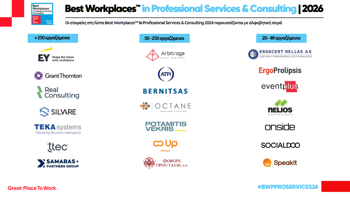 Το Great Place To Work® Hellas ανακοίνωσε την Πέμπτη 22 Ιανουαρίου τη Λίστα Best Workplaces™ in Professional Services & ConsultingHellas 2026 με τις εταιρείες που διακρίνονται ως οι καλύτεροι εργοδότες στην Ελλάδα στους κλάδους παροχής επαγγελματικών & συμβουλευτικών υπηρεσιών.