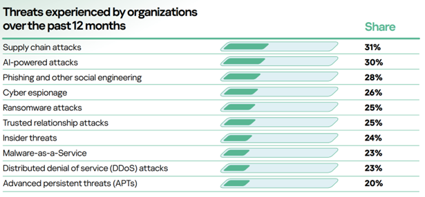 Σύμφωνα με την έρευνα που ανέθεσε η Kaspersky, το 31% των επιχειρήσεων επηρεάστηκε από επίθεση στην εφοδιαστική αλυσίδα κατά τη διάρκεια των τελευταίων 12 μηνών, ποσοστό μεγαλύτερο από οποιονδήποτε άλλο τύπο κυβερνοαπειλής. Ο κίνδυνος για τις εφοδιαστικές αλυσίδες αφορά κυρίως τους οργανισμούς που διαθέτουν πιο εκτεταμένο βαθμό διασύνδεσης, με τις μεγάλες επιχειρήσεις να αναφέρουν το υψηλότερο ποσοστό επιθέσεων — 36% — σε σύγκριση με τις μικρές[2 και μεσαίες[3] επιχειρήσεις.