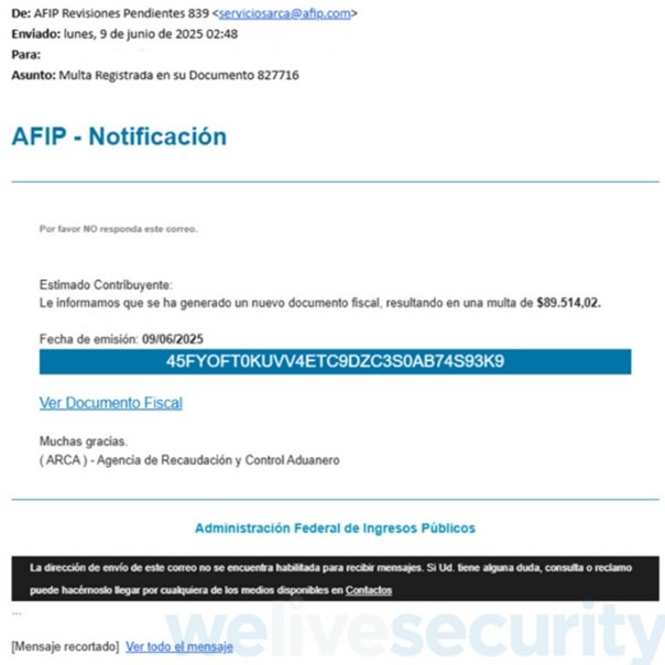Εικόνα 1. Email ηλεκτρονικού ψαρέματος που προσποιείται ότι προέρχεται από μια κρατική υπηρεσία της Αργεντινής, με έναν σύνδεσμο που οδηγεί σε ένα ψεύτικο αρχείο PDF.