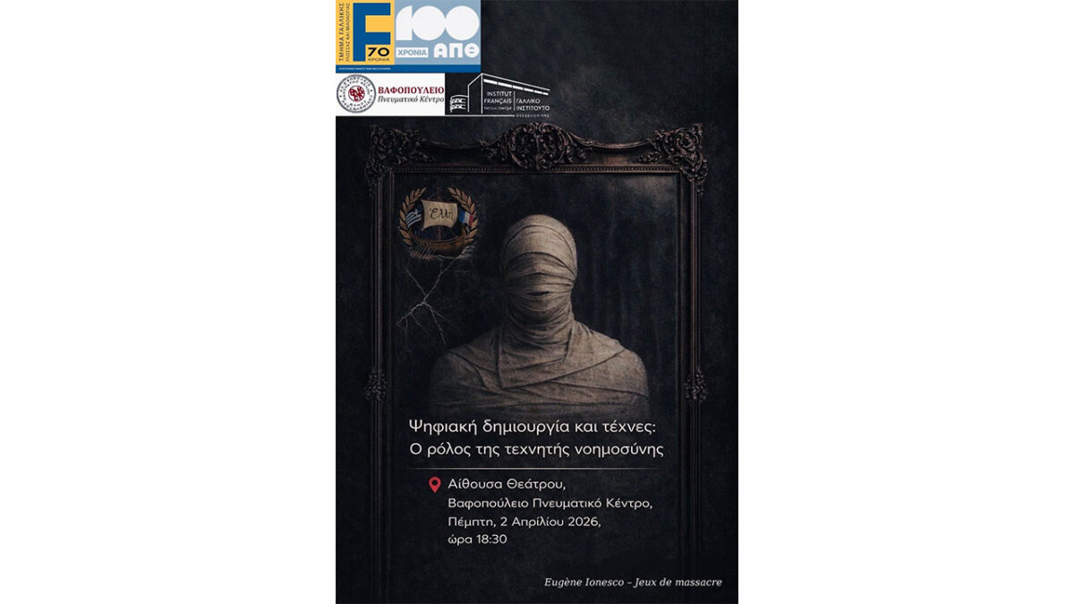 «Ψηφιακή Δημιουργία και Τέχνες: Ο Ρόλος της Τεχνητής Νοημοσύνης» είναι ο τίτλος της εκδήλωσης που διοργανώνει το Τμήμα Γαλλικής Γλώσσας και Φιλολογίας του Αριστοτελείου Πανεπιστημίου, με την υποστήριξη του Γαλλικού Ινστιτούτου Θεσσαλονίκης, την Πέμπτη 2 Απριλίου 2026 και ώρα 18.30, στο Βαφοπούλειο Πνευματικό Κέντρο.