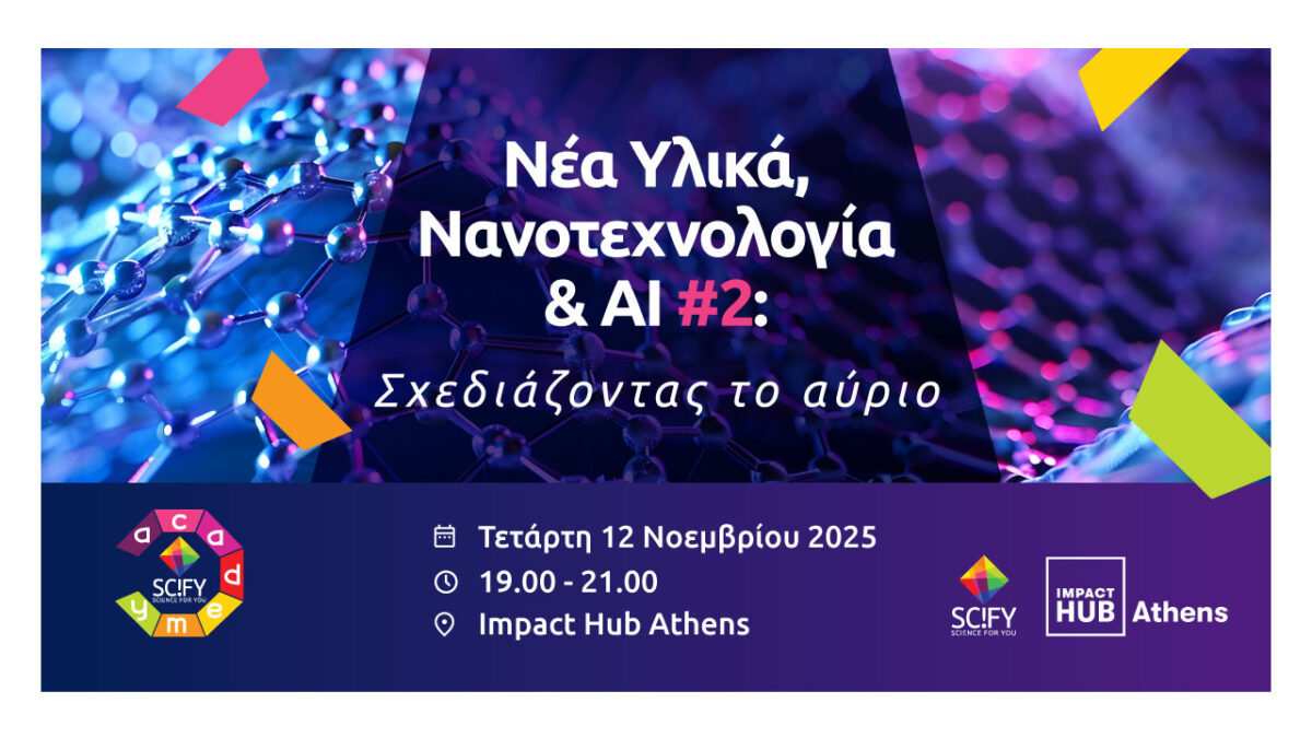 Η Science for You – SciFY σάς προσκαλεί σε ένα ακόμα SciFY Academy event αφιερωμένο στα νέα καινοτόμα υλικά, τη νανοτεχνολογία και την τεχνητή νοημοσύνη. Η δεύτερη εκδήλωση της σειράς “Νέα Υλικά, Νανοτεχνολογία & ΑΙ #2: Σχεδιάζοντας το αύριο” θα πραγματοποιηθεί την Τετάρτη 12 Νοεμβρίου 2025, στις 19:00, στο Impact Hub Athens (Καραϊσκάκη 28, Αθήνα). Διακεκριμένοι ερευνητές, καθηγητές πανεπιστημίων και στελέχη επιχειρήσεων θα μας μιλήσουν με απλά λόγια για το θέμα.