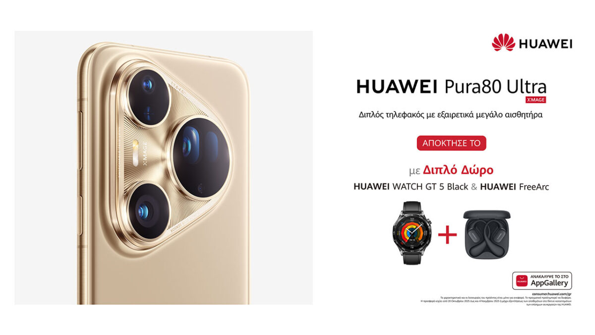 Με κάθε αγορά HUAWEI Pura 80 Pro ή HUAWEI Pura 80 Ultra, οι καταναλωτές λαμβάνουν διπλό δώρο, το smartwatch HUAWEI WATCH GT 5 Black και τα HUAWEI FreeArc ακουστικά. Η προσφορά ισχύει έως τις 4 Νοεμβρίου ή μέχρι εξαντλήσεως των αποθεμάτων.
