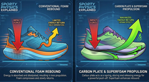 Προτροπή 4: Δημιουργήστε μια τεχνική επεξήγηση ενός σύγχρονου, τυπικού παπουτσιού τρεξίματος σε άσφαλτο, για να εξηγήσετε την επιστροφή ενέργειας και τους φυσικούς παράγοντες που παίζουν ρόλο. Δείξτε πώς λειτουργεί ένα παπούτσι με πλάκα άνθρακα σε σύγκριση με ένα χωρίς και πώς επηρεάζει την ανάκτηση ενέργειας. Επιλέξτε ένα “σπορ” και σύγχρονο στιλ οπτικοποίησης.