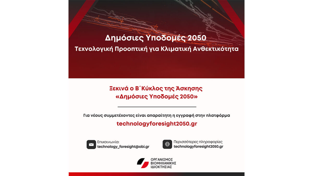 Ο Οργανισμός Βιομηχανικής Ιδιοκτησίας (ΟΒΙ) ανακοινώνει την έναρξη του Β’ Κύκλου της Άσκησης Τεχνολογικής Προοπτικής Διερεύνησης με τίτλο «Δημόσιες Υποδομές 2050 | Τεχνολογική Προοπτική για Κλιματική Ανθεκτικότητα», συνεχίζοντας τη συλλογική προσπάθεια διαμόρφωσης ενός κλιματικά ανθεκτικού τεχνολογικού μέλλοντος για τη χώρα.
